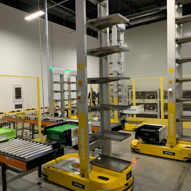 --Our HaiPick robots are used in the side line, the fork can be connected in four directions, and the goods can be placed on the rack smoothly.
