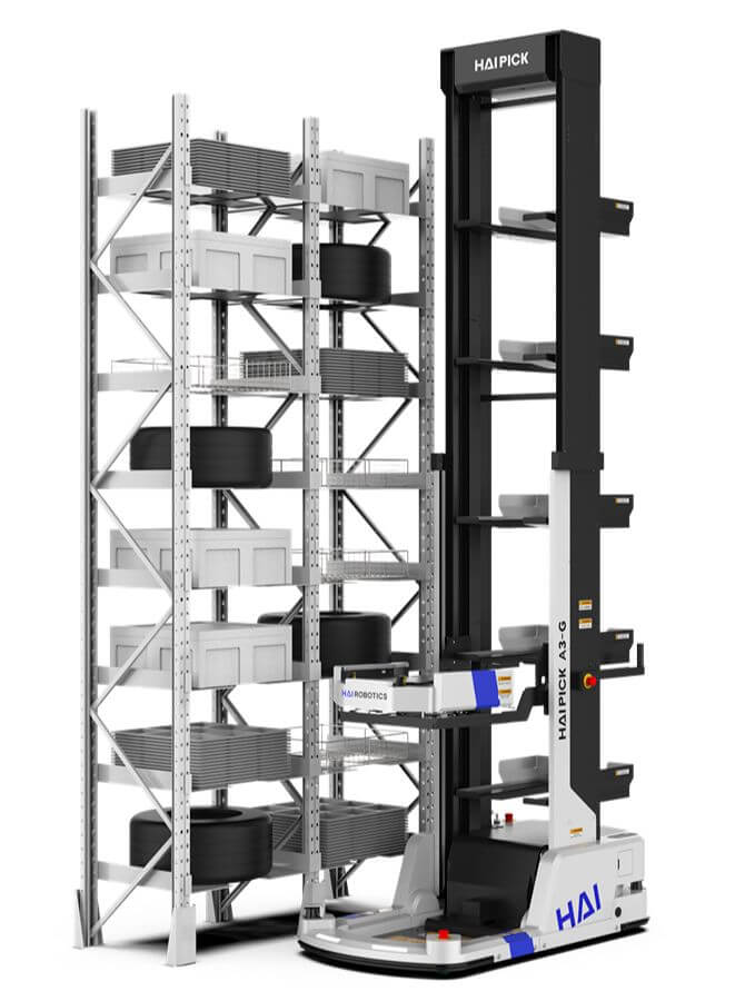 The robot adopts a lifting fork design, compatible with multiple storage materials, such as tires, trays, cases, and cartons, amongst others. The robot can be applied in different scenarios.