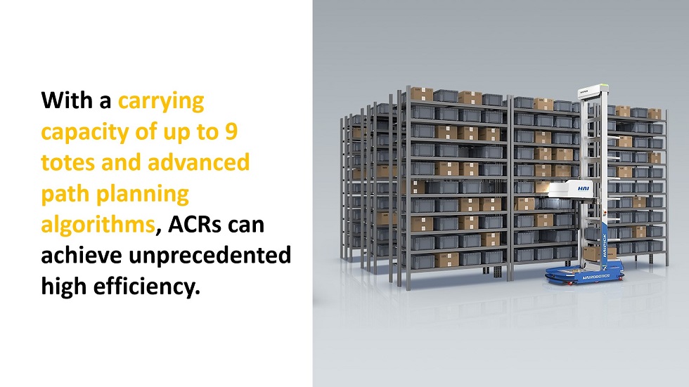 With a carrying capacity of up to 9 totes and advanced path planning algorithms, ACRs can achieve unprecedented high efficiency of 3-4 times (per worker) higher than manual labor.
